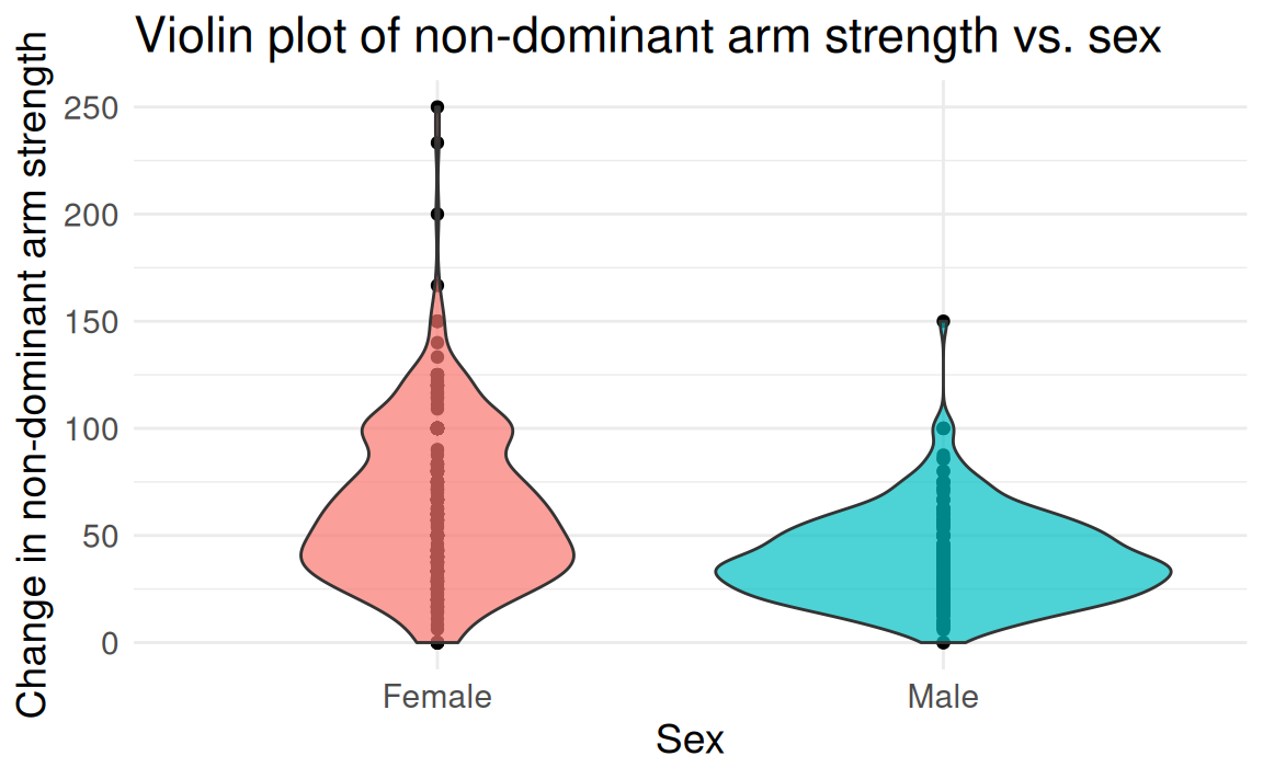 Question: Does change in non-dominant arm strength (ndrm.ch) after resistance training differ between men and women?