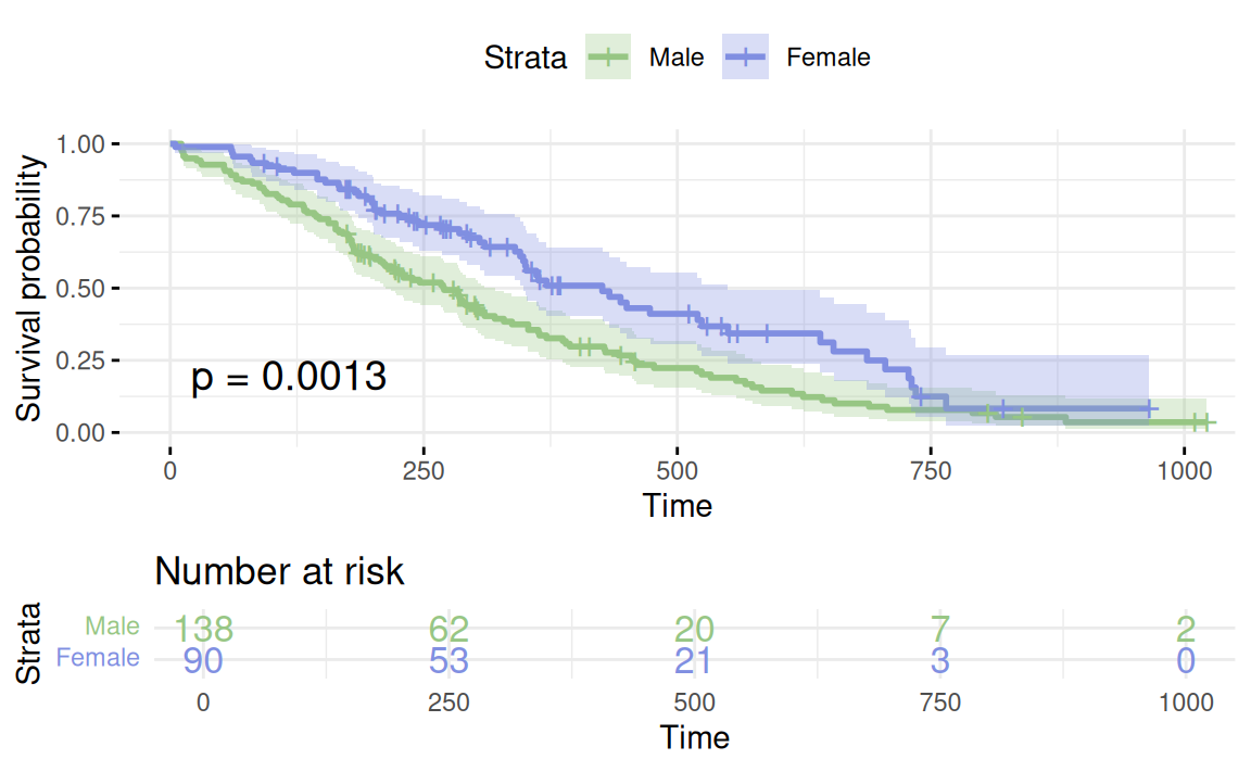 In addition to estimating survival, we may want to compare two groups’ survival functions formally (i.e., via a hypothesis test).